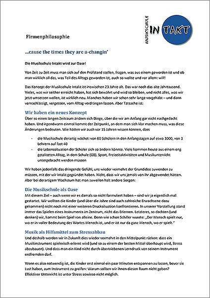 Einblicke in unsere Musikschule geben auch zahlreicher Publikationen und Infoblätter, die wir hier zum Herunterladen als PDF bereitstellen. Einfach auf die Bilder klicken und schon es geht los. Die PDF-Dateien lassen sich ganz nach Wunsch im Webbrowser betrachten, lokal speichern oder auch ausdrucken.