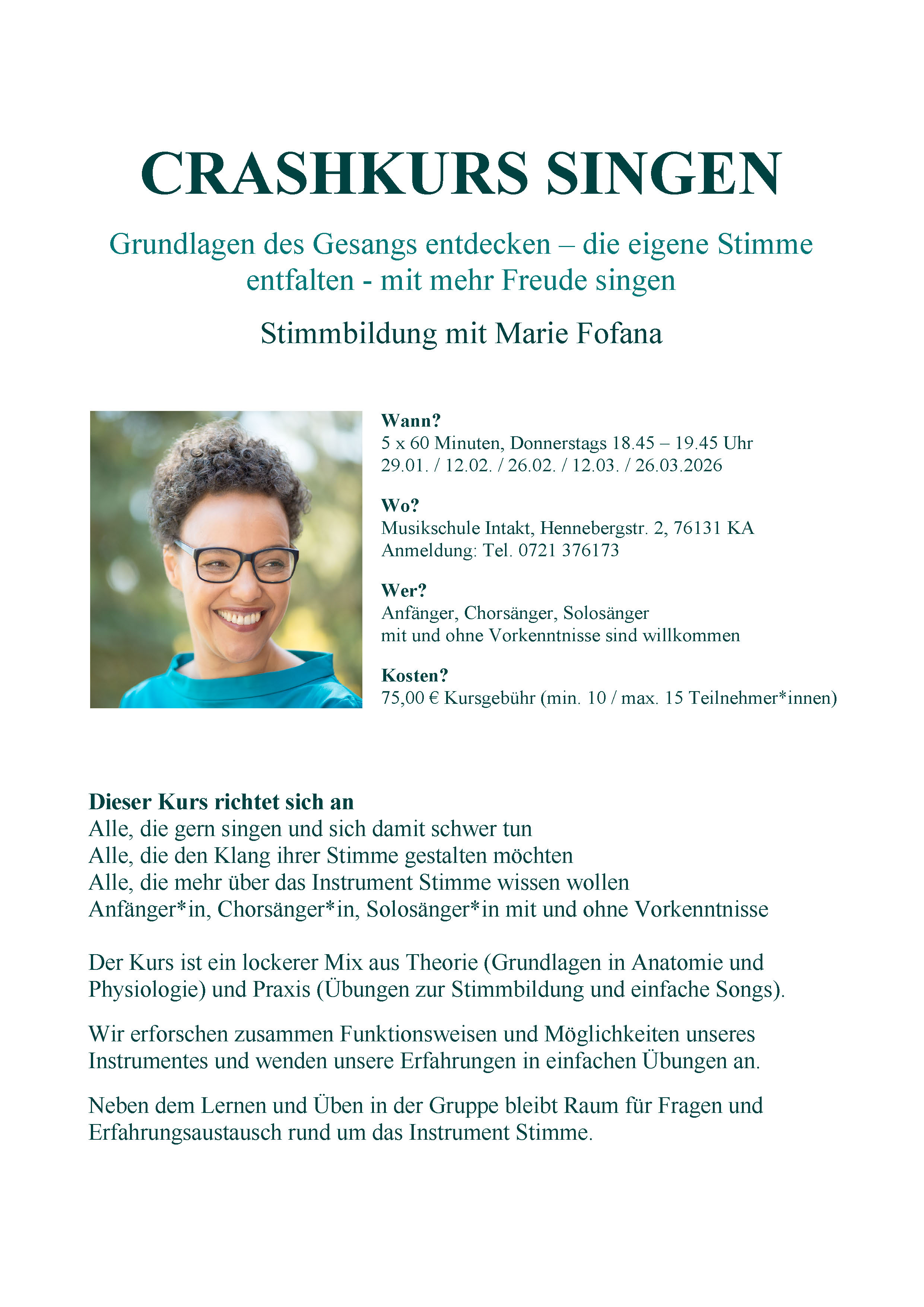 Der Kurs ist ein lockerer Mix aus Theorie (Grundlagen in Anatomie und Physiologie) und Praxis (Übungen zur Stimmbildung und einfache Songs).